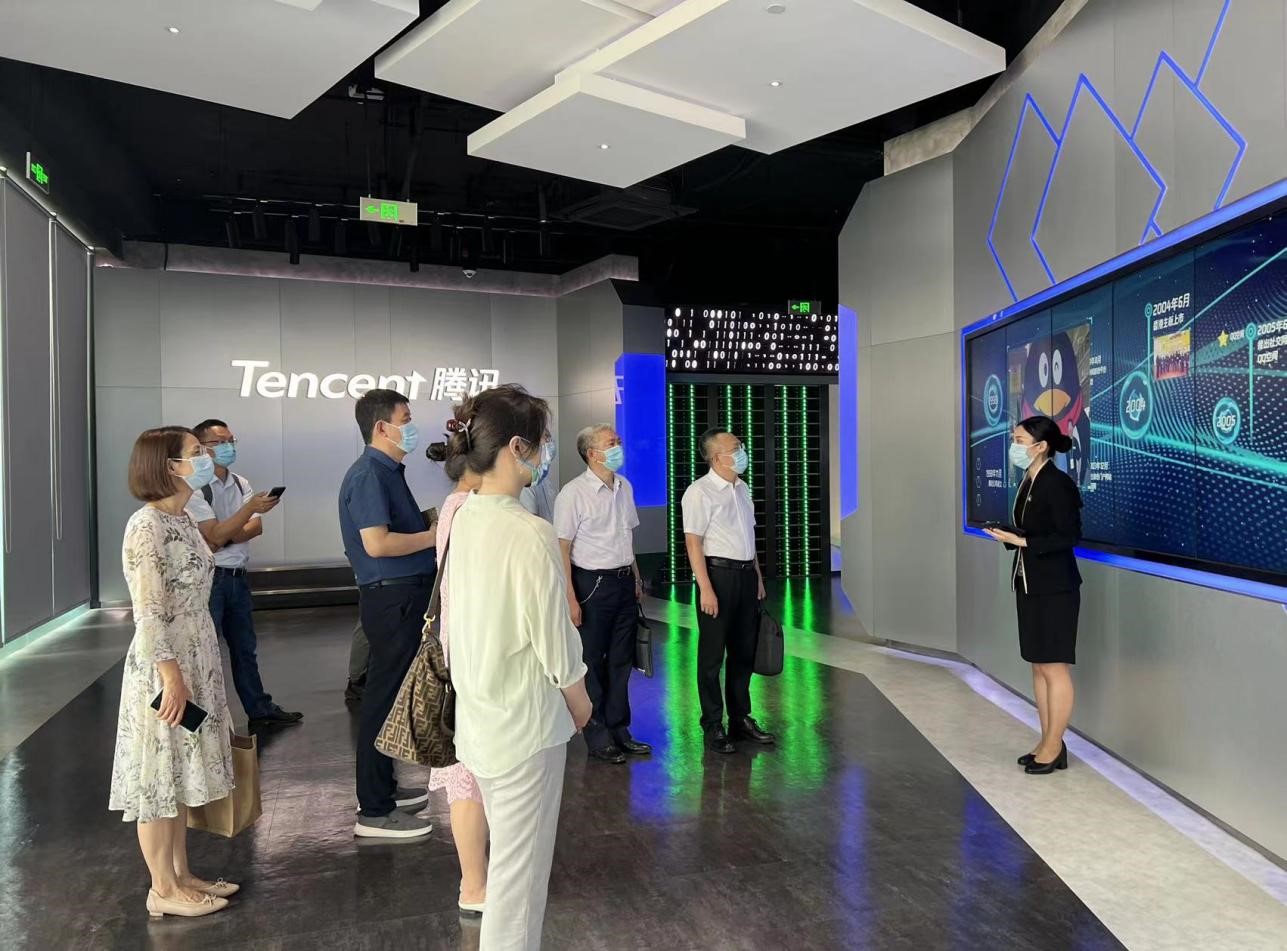 调研团队首先参观了腾讯西南总部企业展厅,了解了腾讯发展历史和现状以及腾讯在科技创新领域取得的成就。参观结束后,在腾讯西南总部大厦会议室,调研团队与腾讯公司副总裁、西南区总经理蔡光忠及其团队成员进行了座谈交流。腾讯游戏副总裁、腾讯游戏学堂院长夏琳及其团队介绍了腾讯互动娱乐事业群的架构和业务内容,就其产学研合作体系、产教融合模式、行业赛事策划、数字文化遗产保护拓展等多方面情况进行了详细说明。
