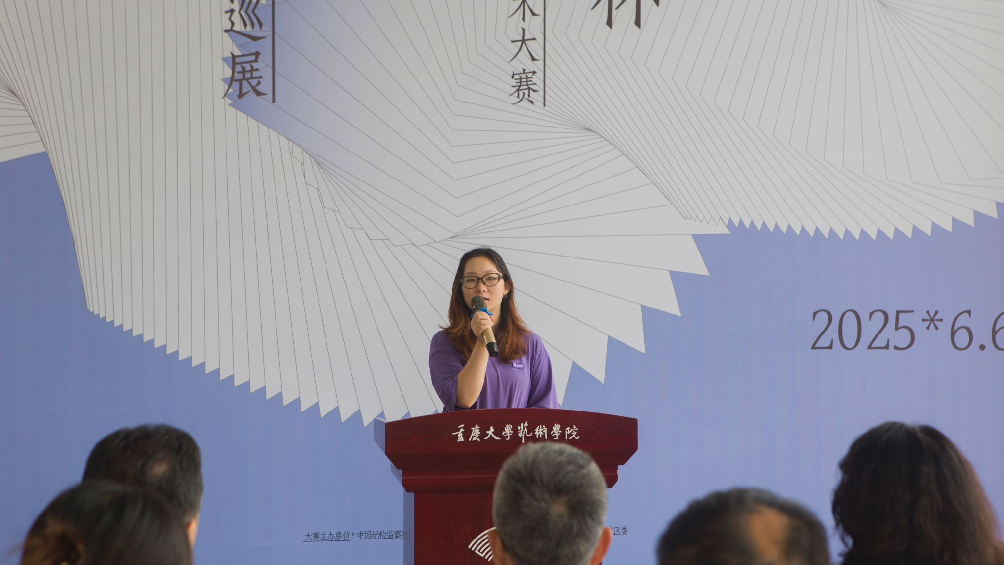 2023 级设计学专业研究生刘珊珊在发言中介绍了自己团队的作品 “君子·青莲”,表示将通过本次展览提供的交流平台进一步学习提高,努力用艺术创作传递正能量,共同为构建廉洁社会贡献一份力量。
