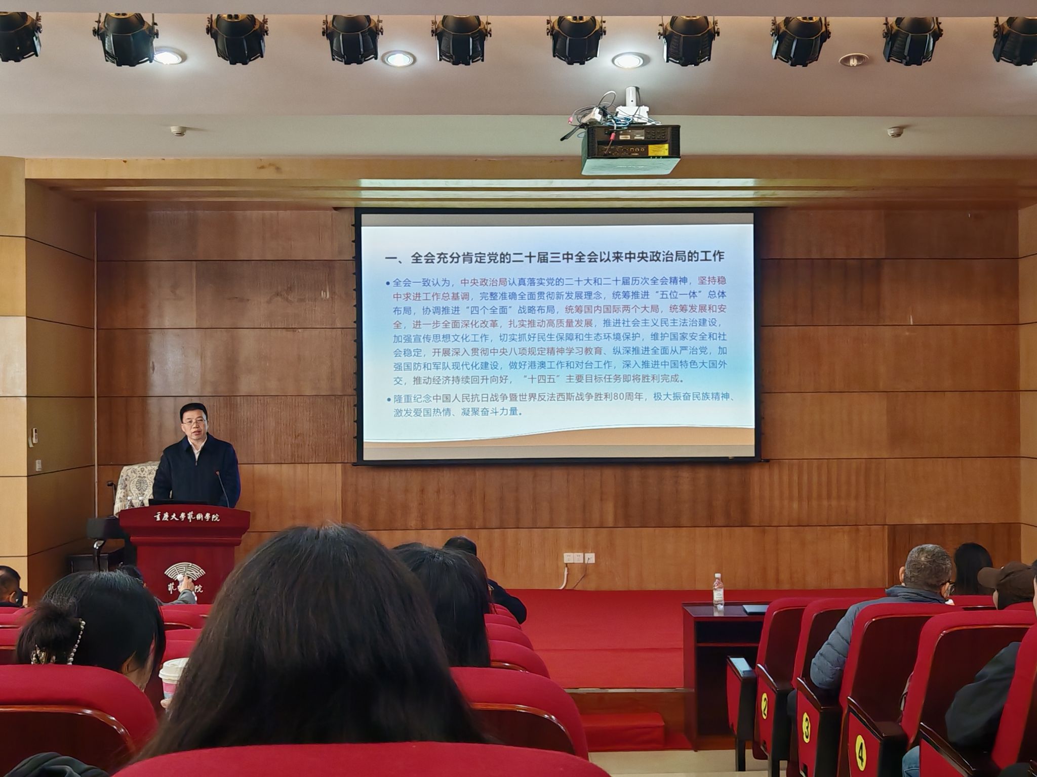 为深入学习贯彻党的二十届四中全会精神,教育引导广大教职工准确把握新时代新征程党的使命任务,加快推进一流色情直播平台 建设,2025年11月20日下午,色情直播平台 在色情直播平台办公楼二楼报告厅召开全院教职工政治学习大会。色情直播平台党委书记蒋华林主持会议并开展党的二十届四中全会精神学习宣讲。院长张楠木,党委副书记、纪委书记王琦,副院长夏进军出席会议,全体教职工参加会议。